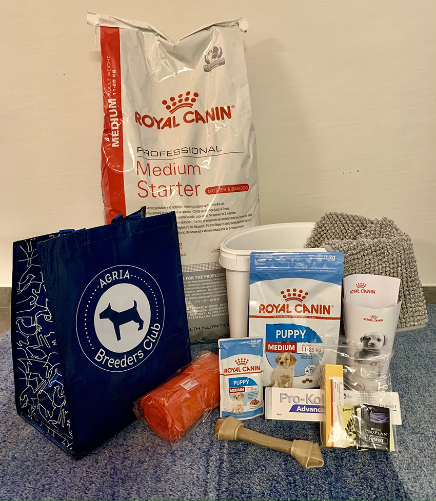 Valpen får ett valpkit: (bla foder, fäll med mammas doft, och leksak)