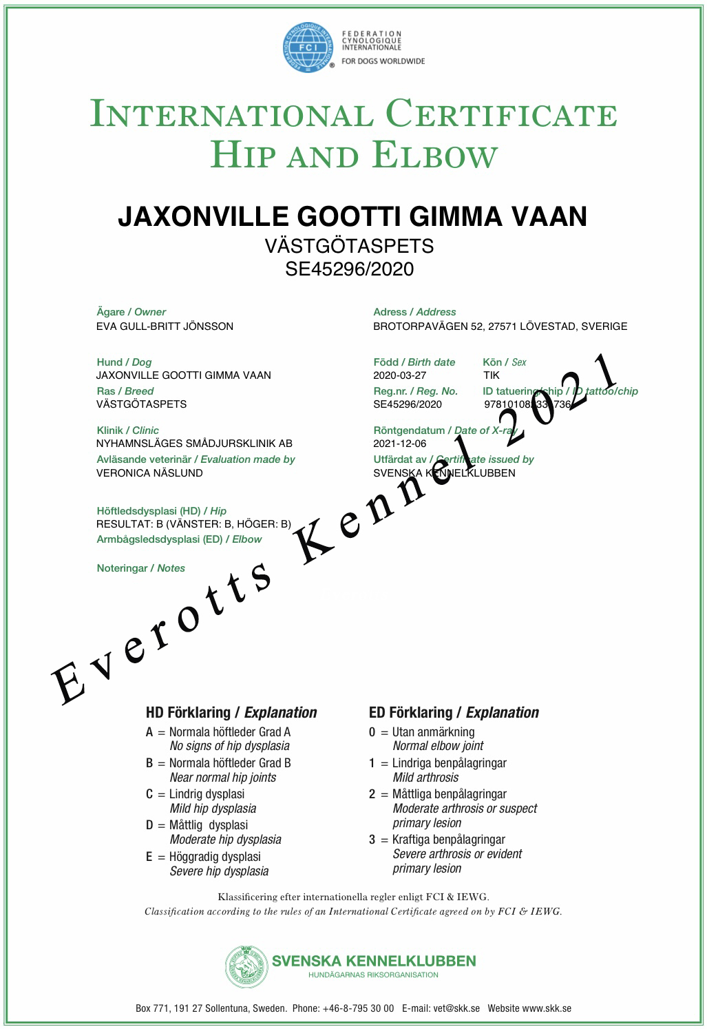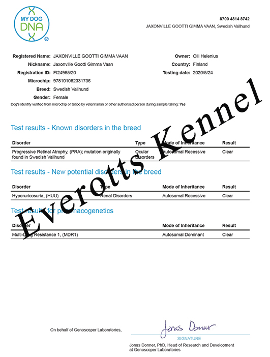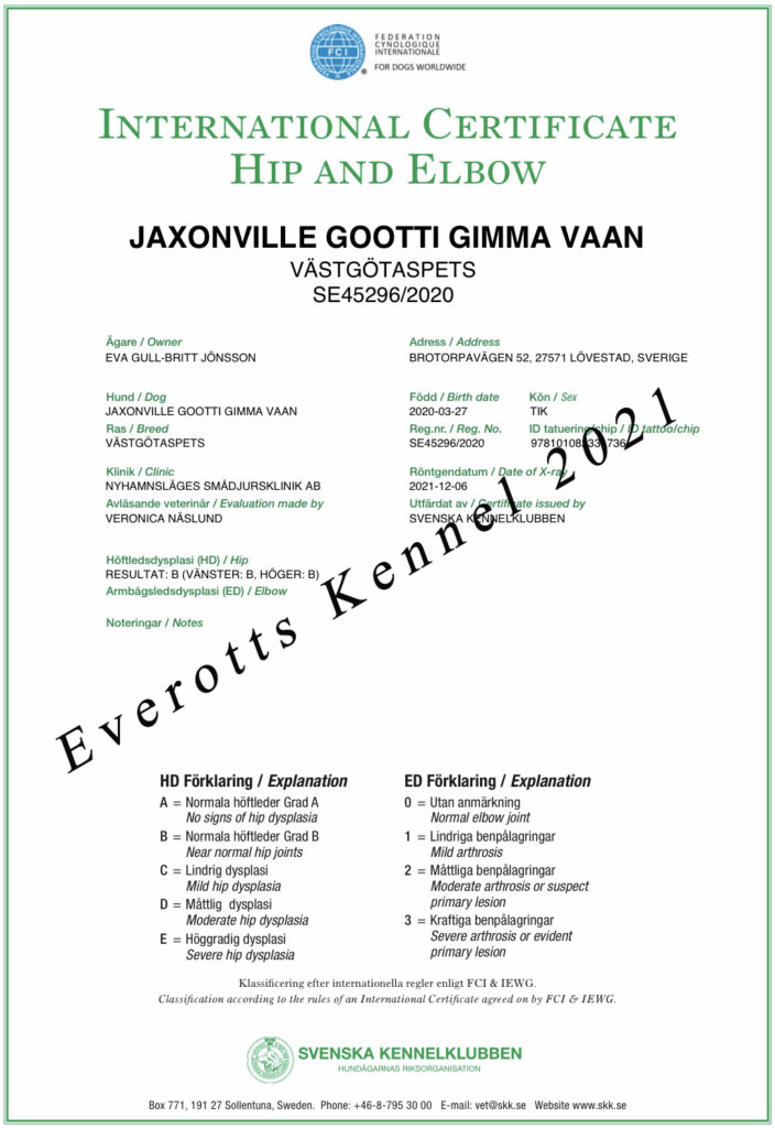 DKUCH Jaxonville Gootti Gimma Vaan Foto Eva JönssonDKUCH Jaxonville Gootti Gimma Vaan 2 år. Foto Eva JönssonBredsten SPK klubshow 220402 Domare Morten Matthes Gimma BIM och tredje certet!Gimma BIM & tog sitt andra CERT 20211204 SPK i Vissenbjerg. Domare Wilma Roem NL. BIR DKUCH Everotts Torbjörn Runsten, sedermera BIS-res, Domare Maoro Monstura!Jaxonville Gootti Gimma Vaan är uppfödd och utvald av Oili Helenius Finland.SPK Vejen 2021-06-12 Junior Cert, CK, Cert, BIM Domare Freddie Kindrup.Gimma är röntgad med B – höfter, alldeles utmärkt!Gimma är gentestad och CLEAR för bla retinopati.